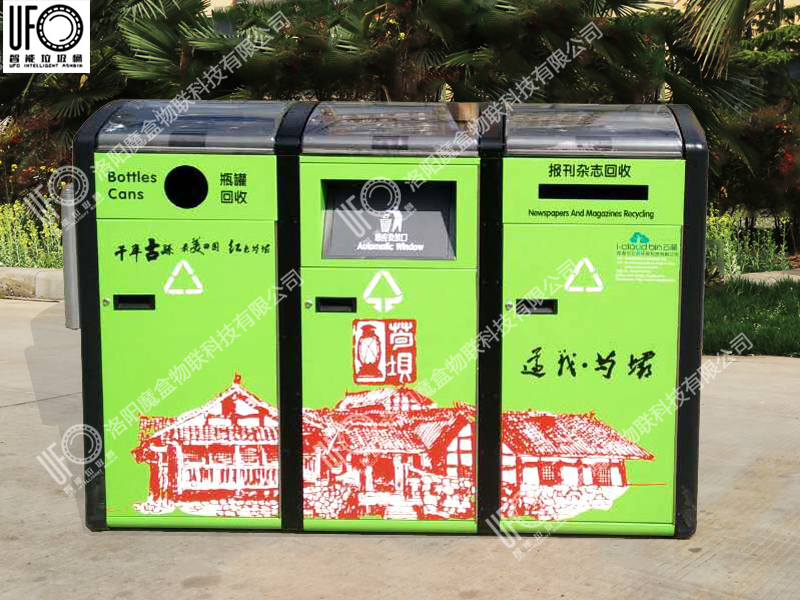 垃圾箱通過不同投放口進(jìn)行垃圾分類引導(dǎo),內(nèi)部設(shè)有壓縮系統(tǒng),用箱頂?shù)奶柲茈姵匕骞╇?可自動對投入的垃圾進(jìn)行壓縮。