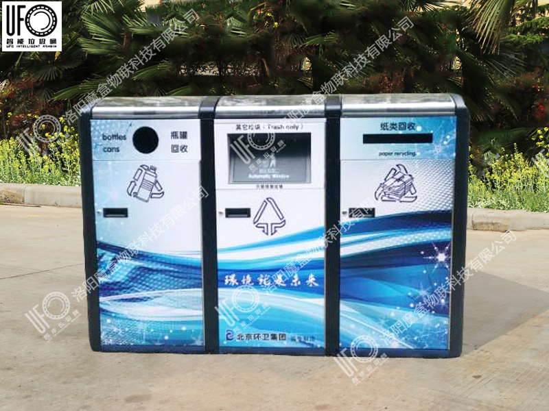 垃圾箱通過不同投放口進(jìn)行垃圾分類引導(dǎo),內(nèi)部設(shè)有壓縮系統(tǒng),用箱頂?shù)奶?yáng)能電池板供電,可自動(dòng)對(duì)投入的垃圾進(jìn)行壓縮。