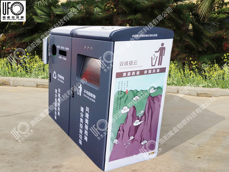 垃圾箱通過不同投放口進(jìn)行垃圾分類引導(dǎo),內(nèi)部設(shè)有壓縮系統(tǒng),用箱頂?shù)奶柲茈姵匕骞╇?可自動(dòng)對投入的垃圾進(jìn)行壓縮。